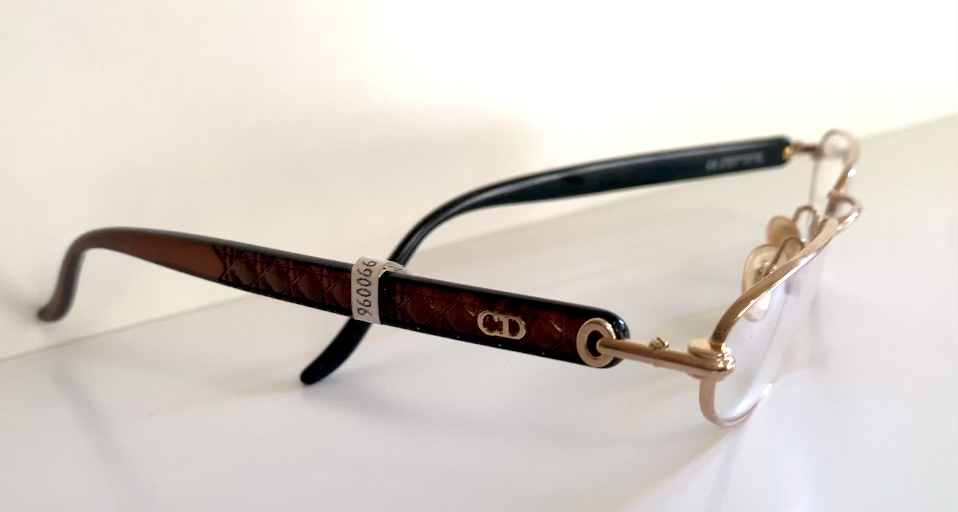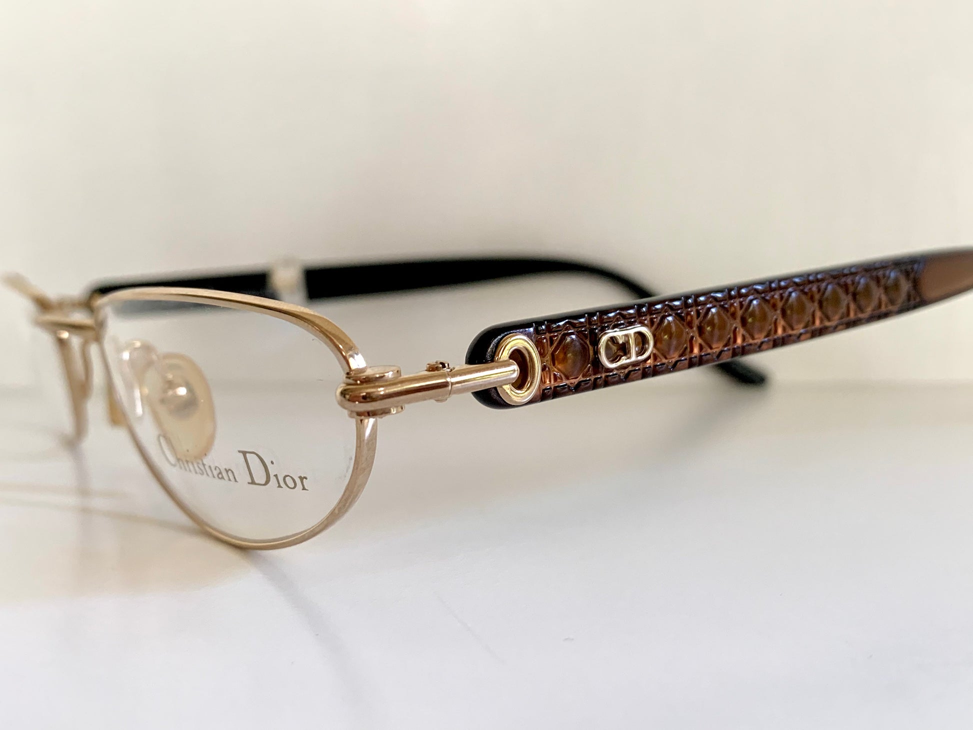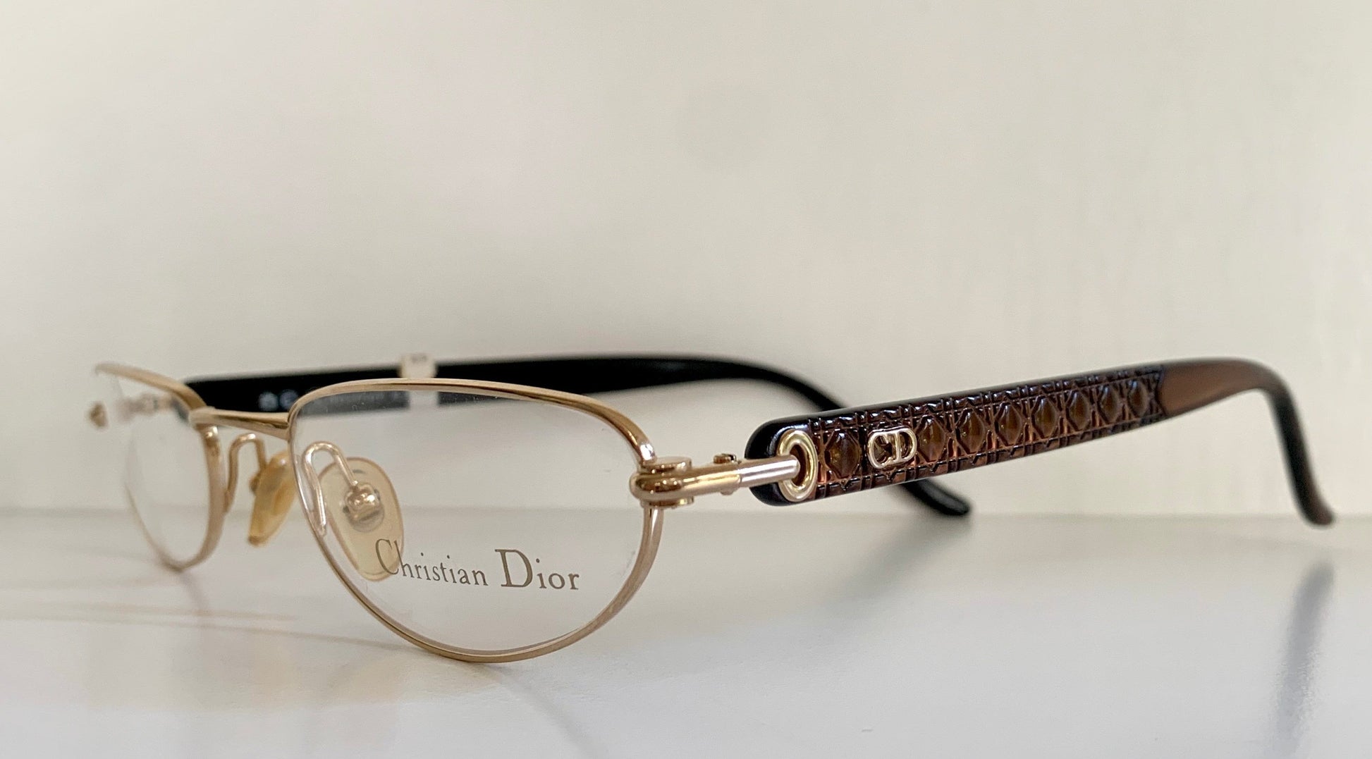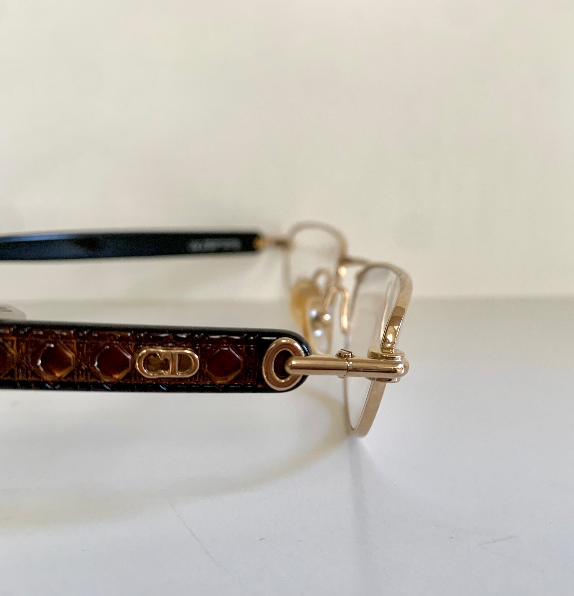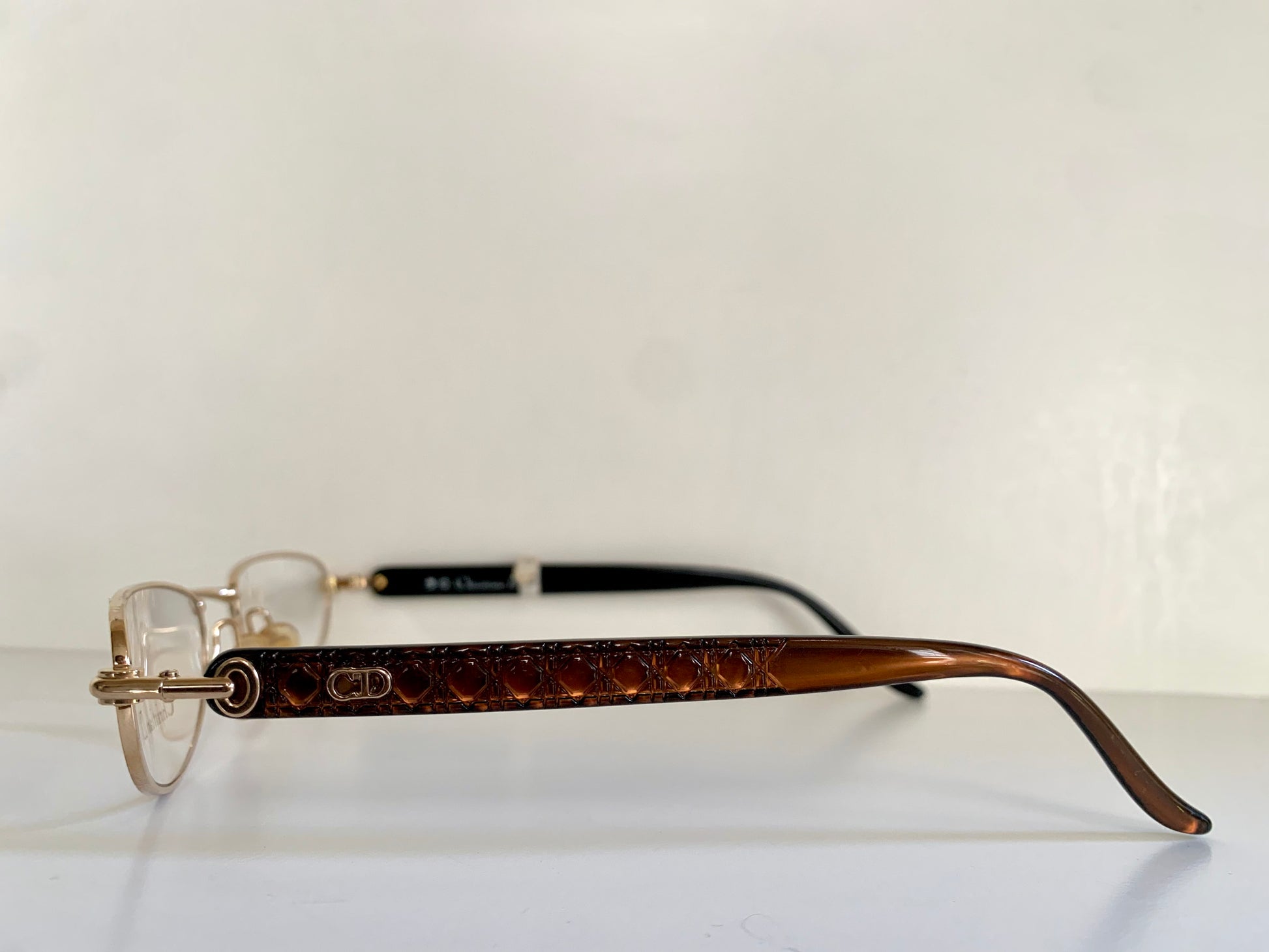 Golden half-moon metal frame and brown temples with CD logos.