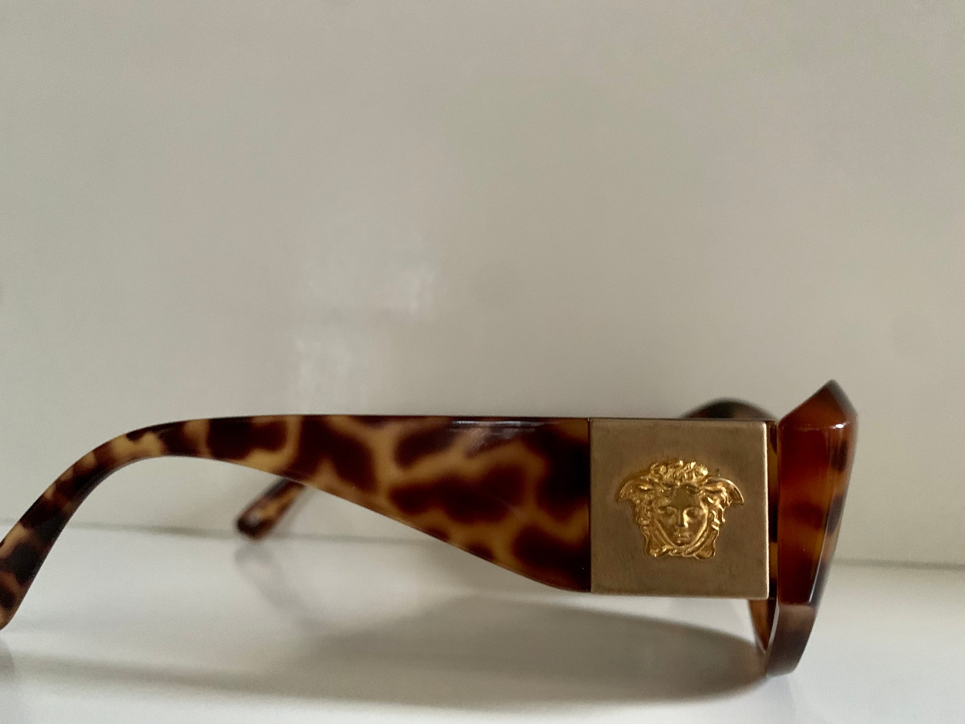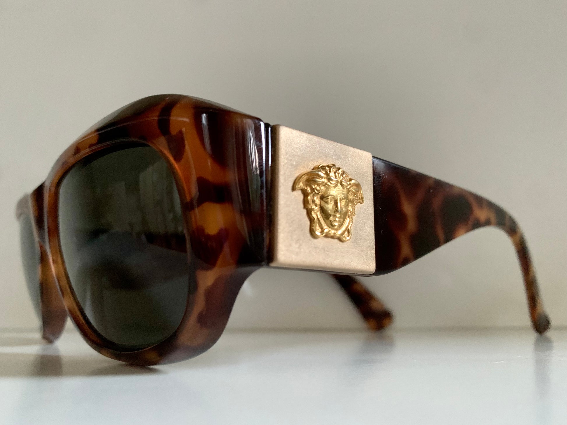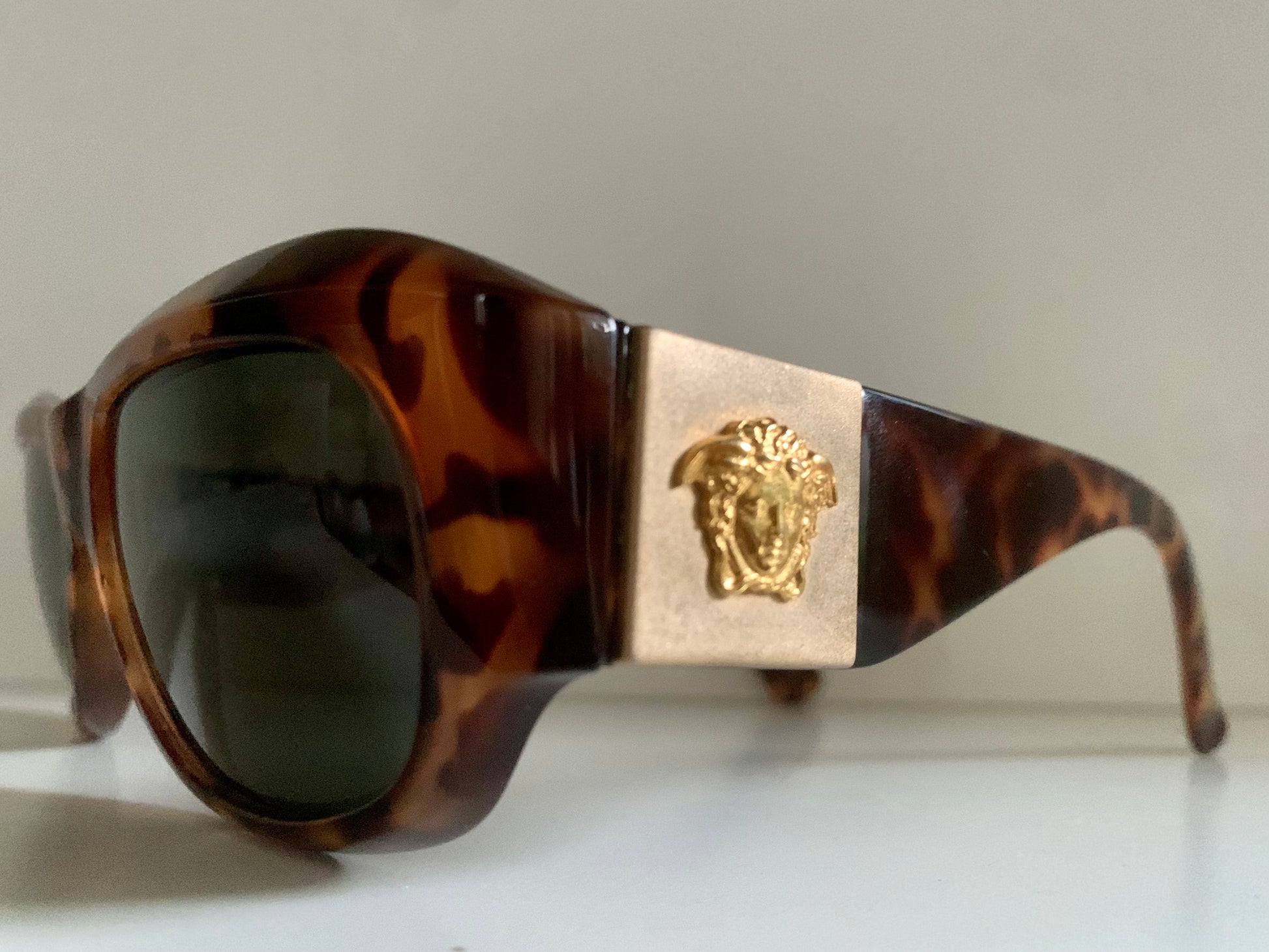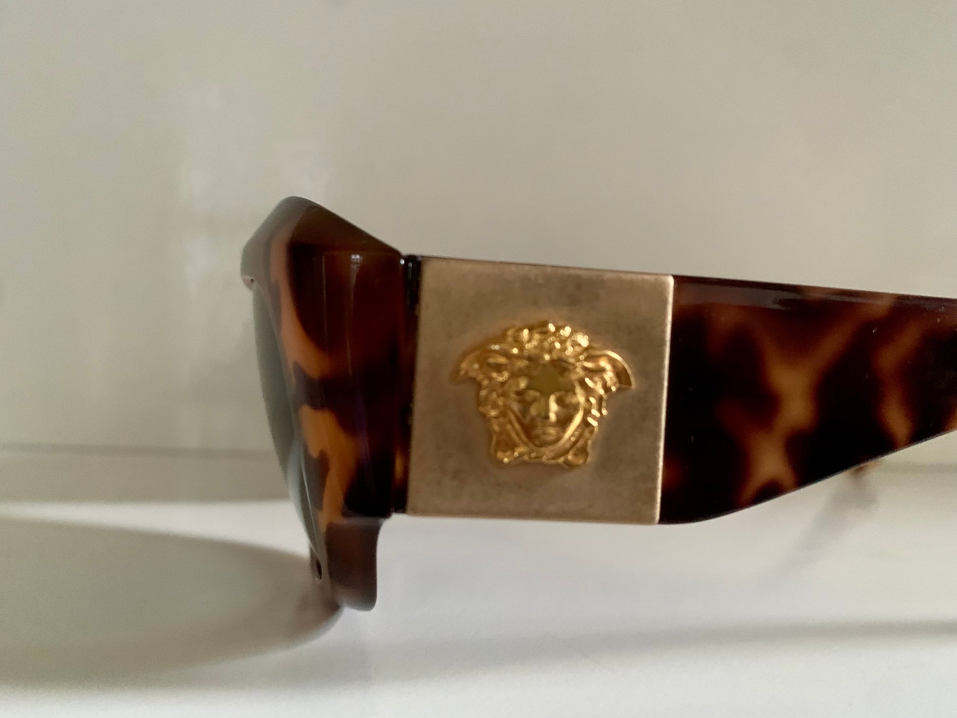 Brown tortoise thick acetate frame with golden Gianni Versace medusa logo.