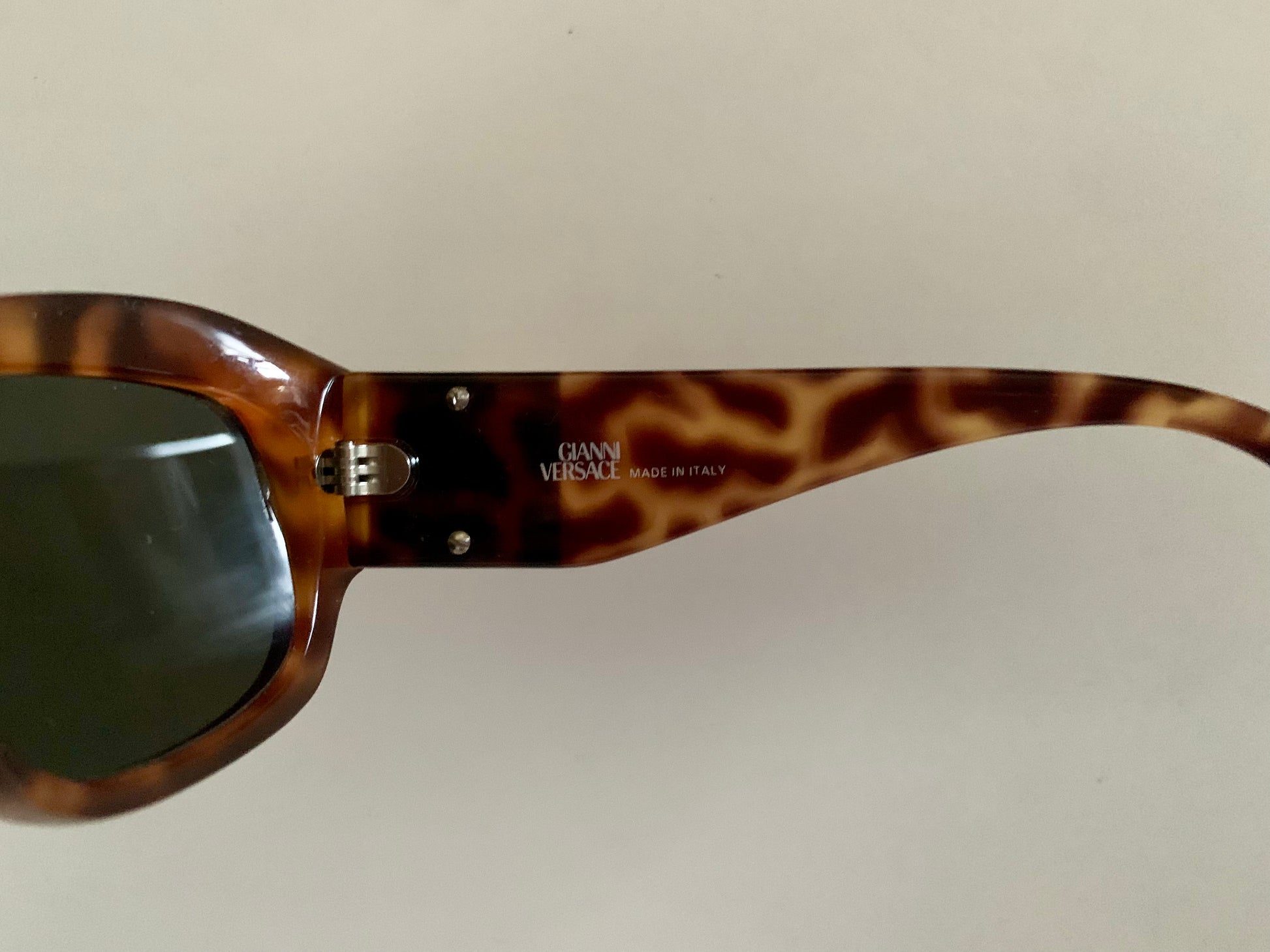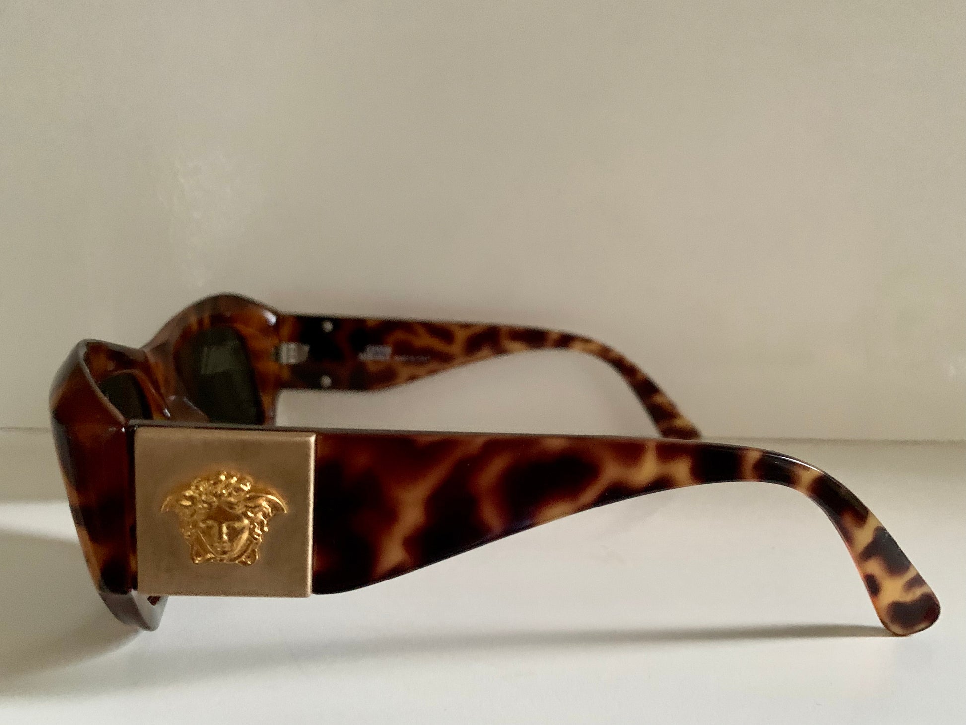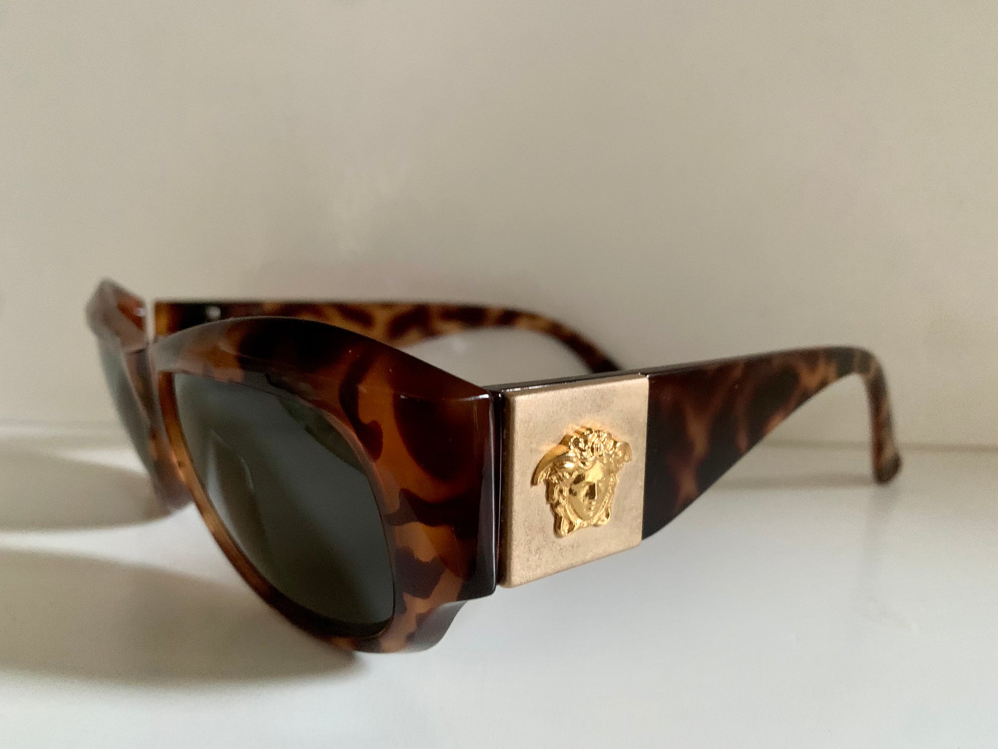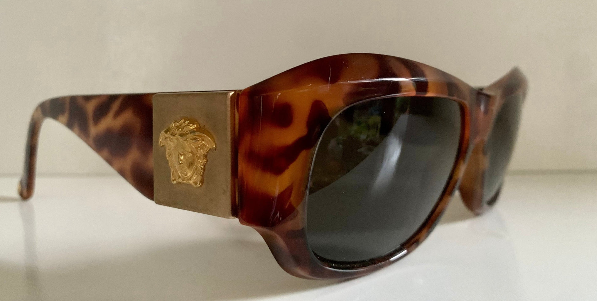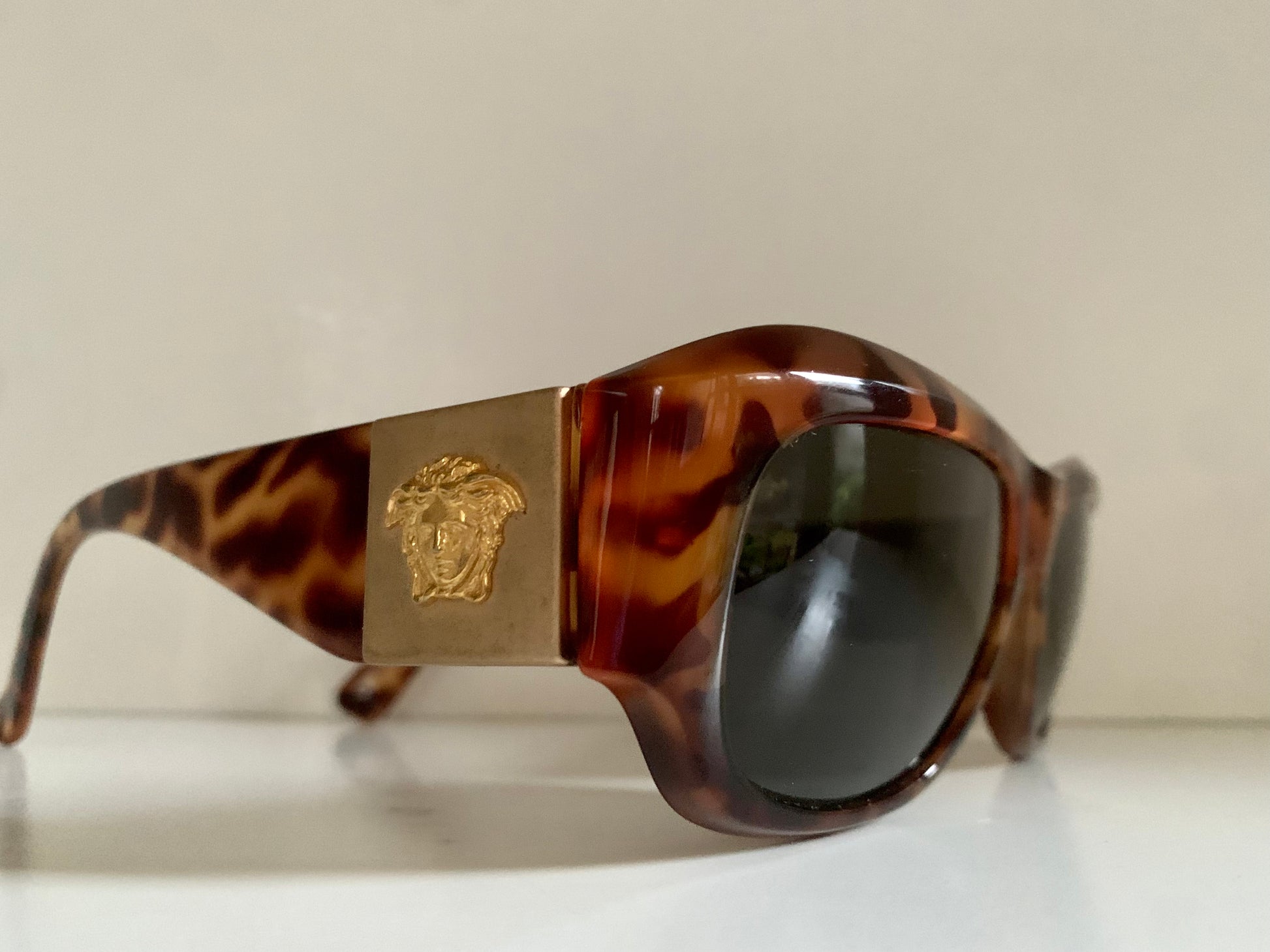 Brown tortoise thick acetate frame with golden Gianni Versace medusa logo.