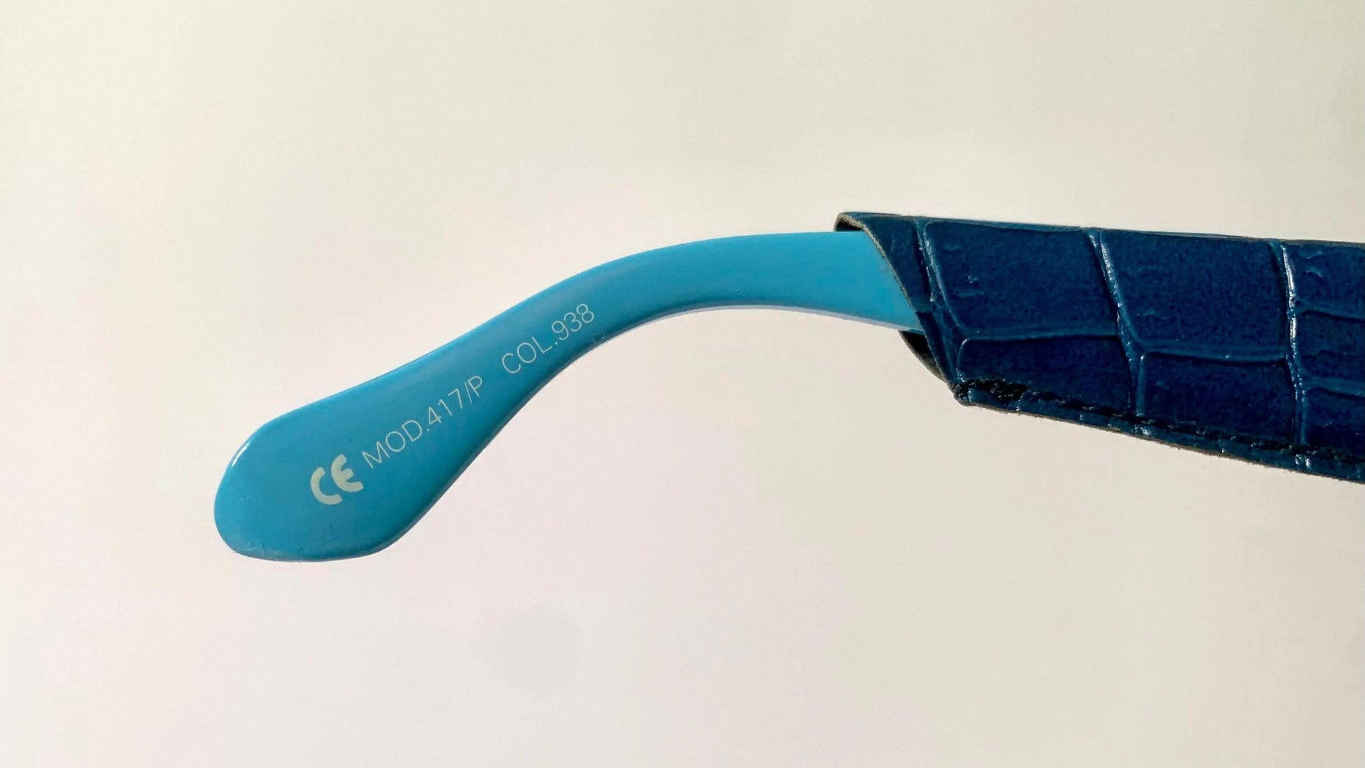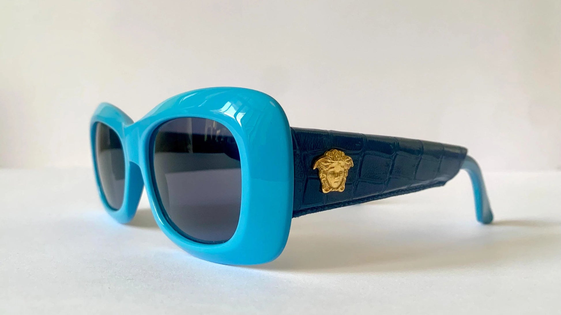 Turquoise blue frame with leather darker blue temples. Versace medusa logo on both sides