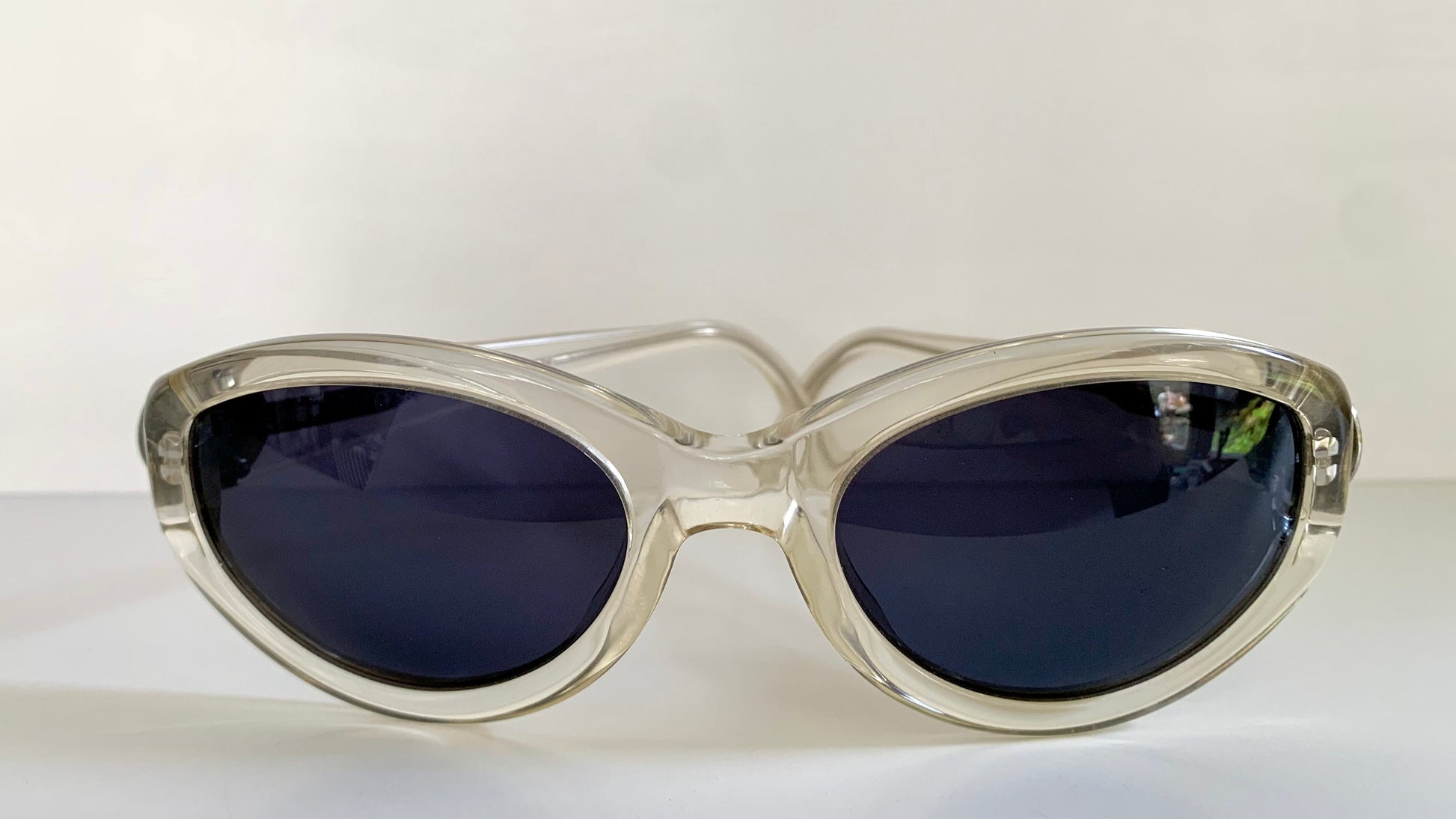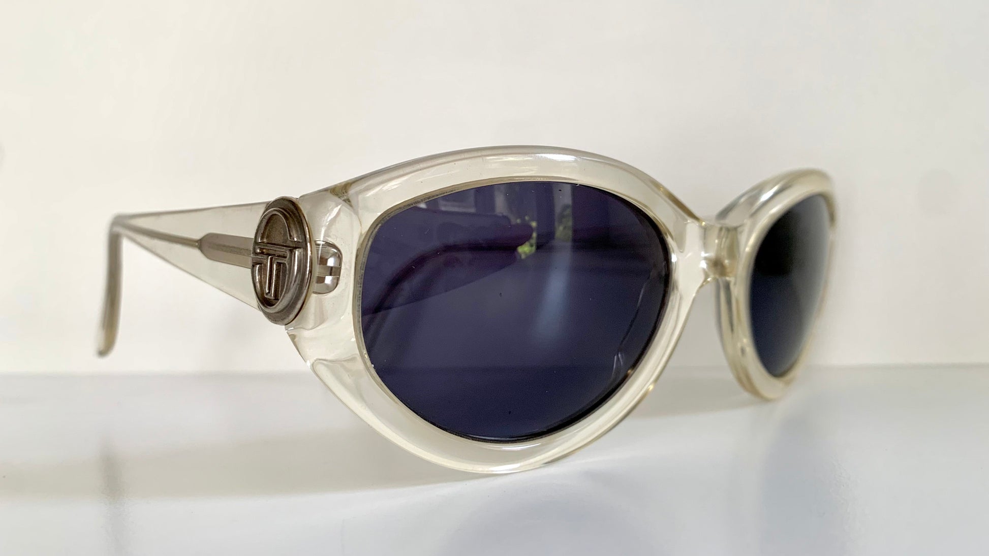 Clear acetate oval frame with silver logos in each temple.