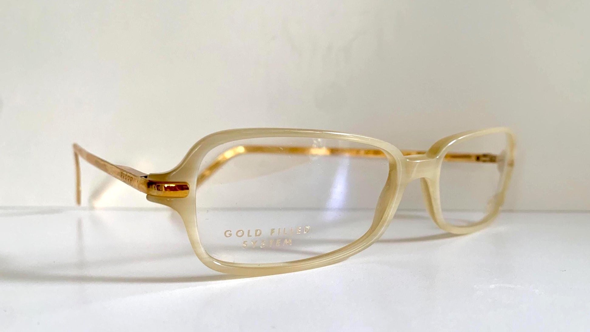 White/bone acetate and gold filled metal frame.